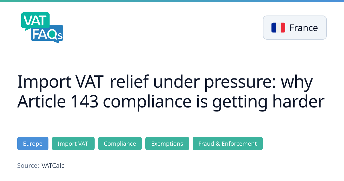 VATCalc explains how France’s 2026 reforms are tightening access to Article 143 import VAT relief, requiring non‑EU importers to hold a French VAT registration or an accredited fiscal representative. The EU exemption remains unchanged, but enforcement across the EU is becoming stricter, with the European Court of Auditors pointing out weaknesses in Procedure 42. Businesses must adapt supply chains or adopt technology to meet the new compliance thresholds.