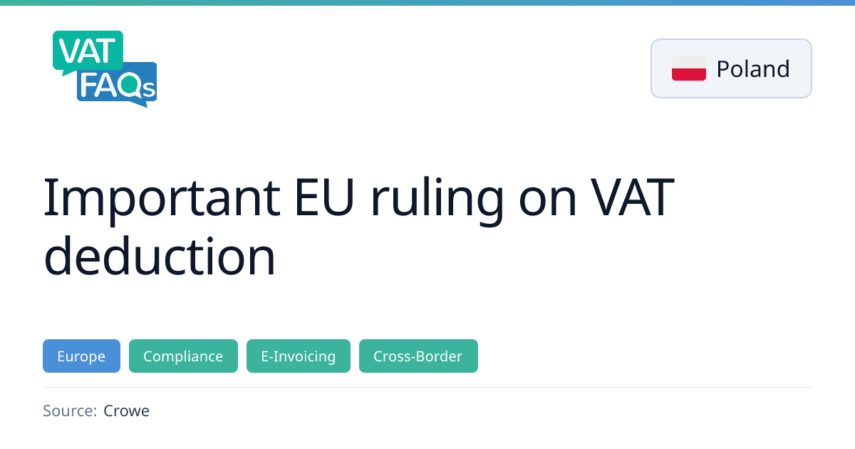 On 2 December 2026, the Court of Justice of the European Union ruled that the right to deduct VAT arises when a taxable transaction occurs, not when the invoice is received. The decision invalidates Polish rules that tie VAT deduction to invoice receipt, allowing businesses to claim VAT earlier if the invoice is received before the tax return deadline. The ruling is expected to improve cash flow for companies across the EU.