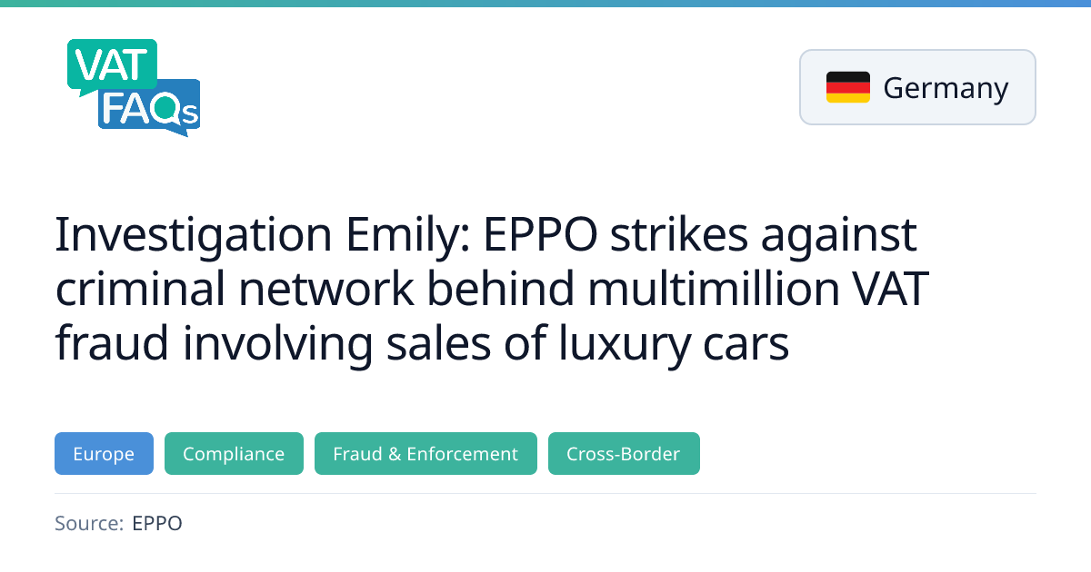 The European Public Prosecutor’s Office (EPPO) launched an EU‑wide investigation into a cross‑border VAT carousel fraud scheme involving luxury cars, estimating tax damage of over €103 million. Nine suspects were detained in Czechia and Germany, with more than 150 searches carried out in nine EU countries and assets seized worth €13.5 million. The offences span the period 2017‑2025.
