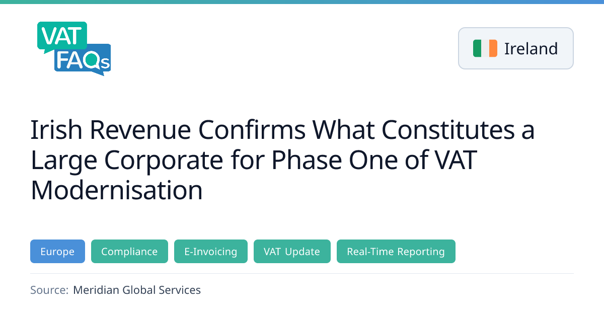 Ireland’s Revenue has identified the large corporates that will be subject to Phase One of the VAT Modernisation programme, requiring them to issue structured eInvoices from 1 November 2028. All Irish businesses must also be able to receive such eInvoices from the same date, ahead of the EU-wide ViDA cross‑border rules set for July 2030.