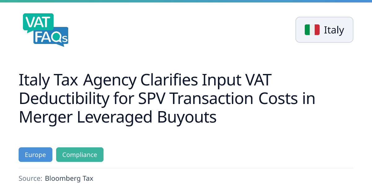 The Italian Revenue Agency issued Resolution No. 7/2026 on 12 February 2026, clarifying that SPVs can deduct input VAT on transaction costs in merger leveraged buyouts only if the taxpayer qualifies as a taxable person and the goods/services are used for taxable economic activities. Holding companies that merely own shares without management participation cannot deduct input VAT. The resolution also addresses the deductibility for holding companies acting as SPVs.