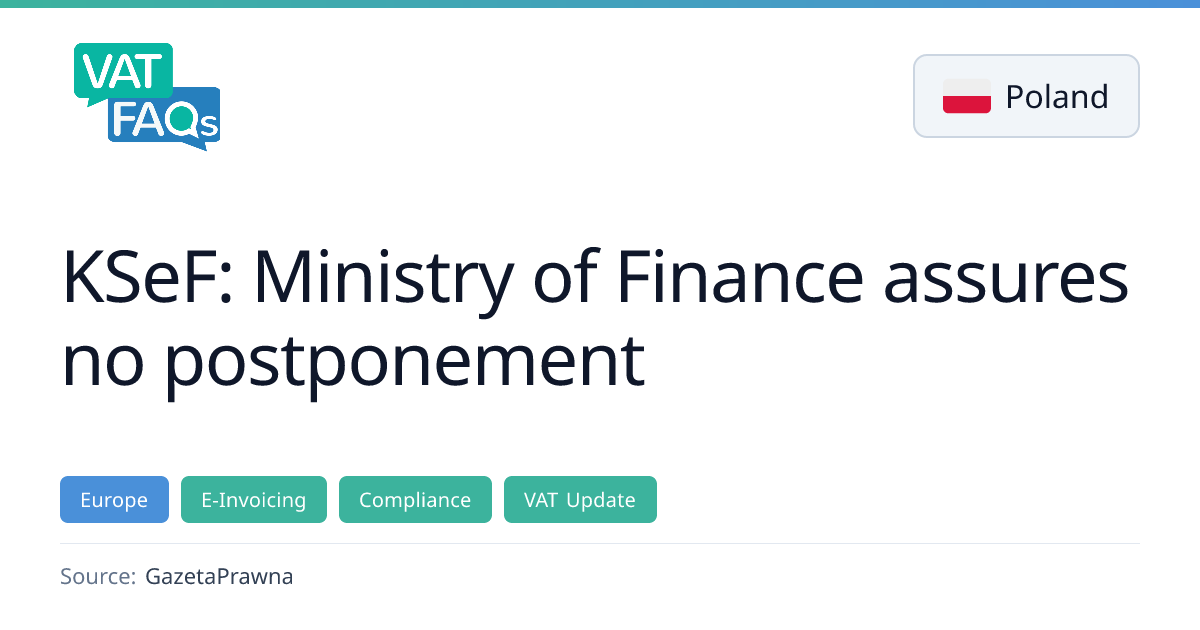 Poland’s Ministry of Finance has extended the phased launch of the KSeF e‑invoicing system, with large taxpayers required to go live on 1 Feb 2026 and other businesses on 1 Apr 2026. No monetary penalties will apply for KSeF breaches during 2026, but administrative fines may be imposed from 1 Jan 2027. Additional requirements include bank‑transfer ID references from 1 Aug 2026 and mandatory acceptance of KSeF invoices by Polish VAT‑registered customers.