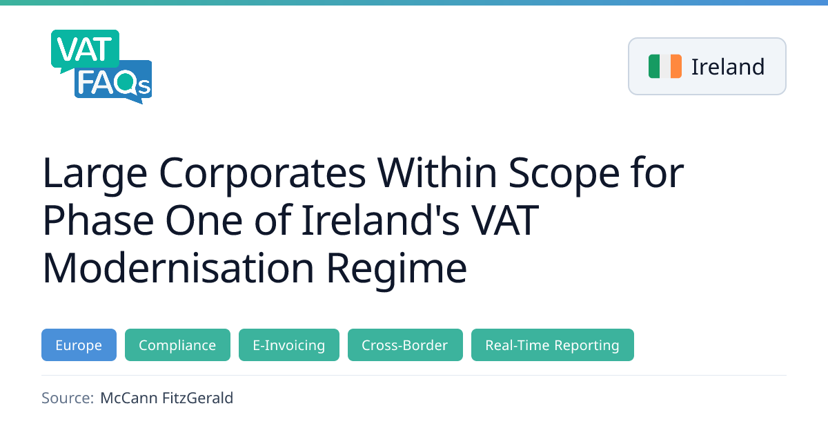 Ireland’s Revenue has identified the large corporates that will be subject to Phase One of the VAT Modernisation programme, requiring them to issue structured eInvoices from 1 November 2028. All Irish businesses must also be able to receive such eInvoices from the same date, ahead of the EU-wide ViDA cross‑border rules set for July 2030.
