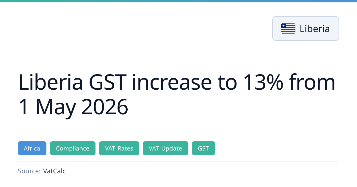 From 1 May 2026, Liberia's standard GST rate increases to 13%.