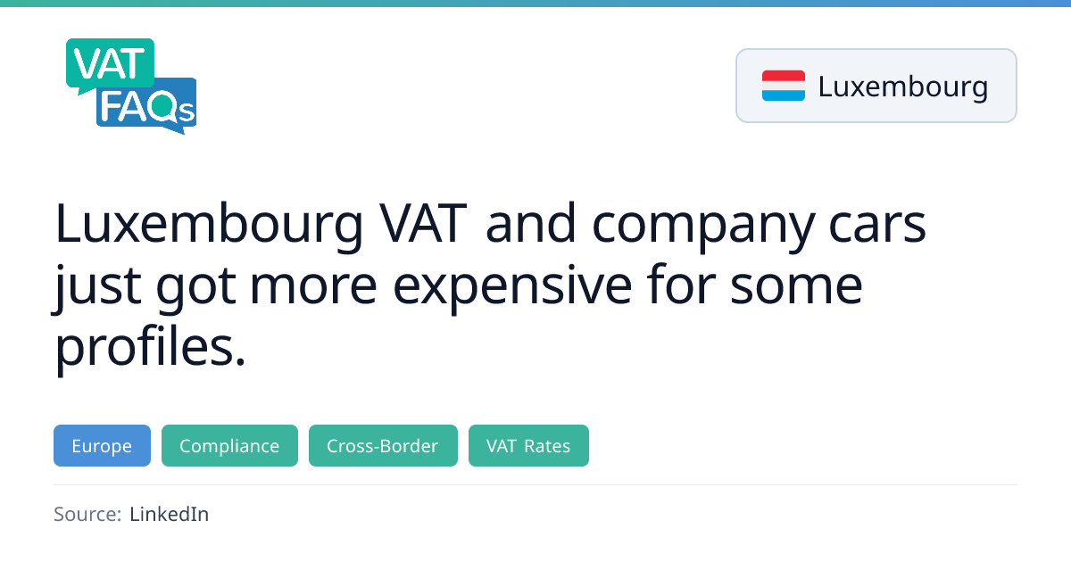 Circular 807-1, issued in October 2025, removed the ability for Luxembourg resident employees in taxable rental car policies to reduce the taxable base for business mileage, potentially increasing VAT costs.