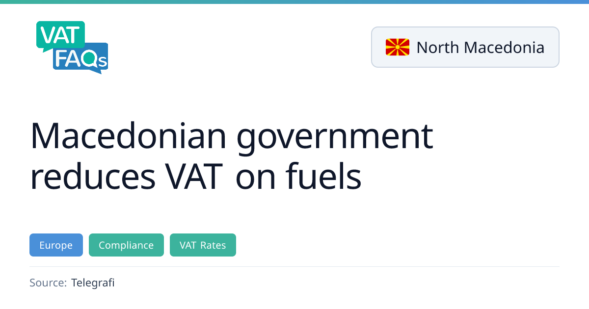 The North Macedonian government announced a reduction of the VAT rate on fuel from 18% to 10% to curb rising fuel prices. Gasoline prices remain unchanged, while diesel will rise by only 3–3.5 denars per litre. The change was approved in an extraordinary meeting on 22 March 2026.