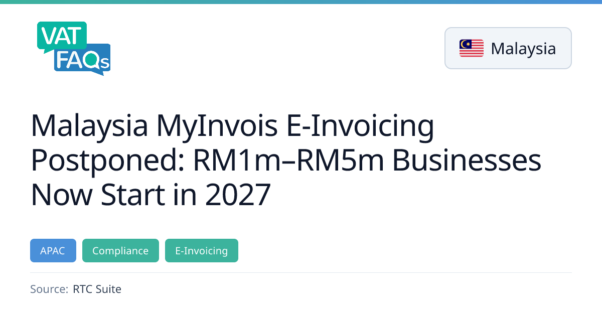 Malaysia has postponed the rollout of its MyInvois e‑invoicing system for businesses with annual turnover between RM1 million and RM5 million, moving the implementation date to 2027. The change reflects a shift in the national e‑invoicing roadmap and raises the threshold for mandatory e‑invoicing. Businesses in this turnover bracket must prepare to comply by 2027.