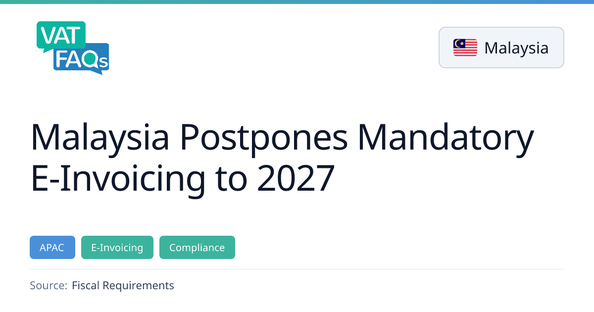 Malaysia has postponed the rollout of its MyInvois e‑invoicing system for businesses with annual turnover between RM1 million and RM5 million, moving the implementation date to 2027. The change reflects a shift in the national e‑invoicing roadmap and raises the threshold for mandatory e‑invoicing. Businesses in this turnover bracket must prepare to comply by 2027.