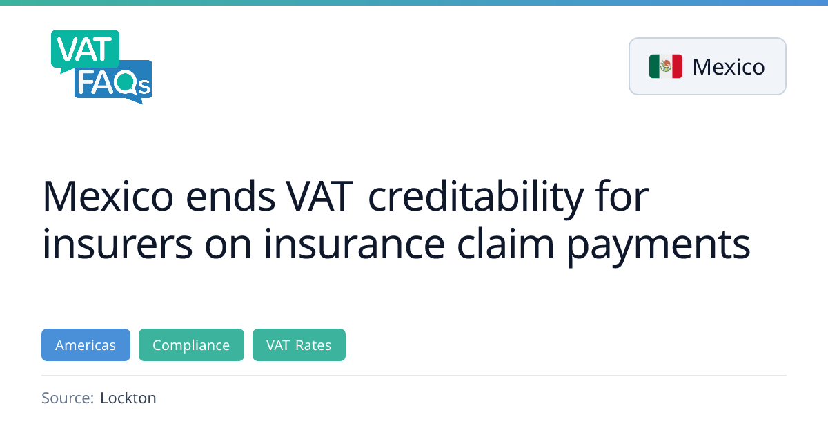 Mexico has enacted a tax reform that removes VAT creditability for insurers on direct payments for goods and services used to settle insurance claims. The reform, effective 1 January 2026 and retroactive to the 2025 fiscal year, turns VAT into a non‑recoverable cost, potentially raising premiums by 8‑10% for medical and auto insurance. Insurers must adjust their claim settlement and pricing strategies accordingly.