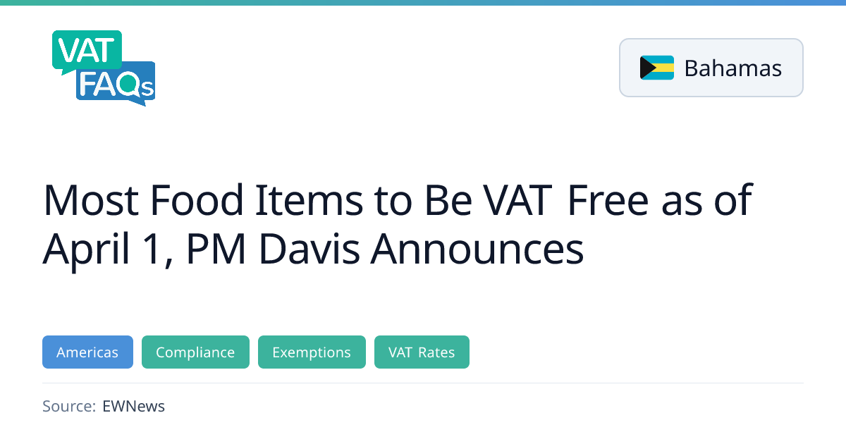The Bahamas Prime Minister announced that VAT on unprepared food will be removed, effective 1 April 2026, bringing the rate to 0%. The announcement also includes a reduction of the overall VAT rate from 12% to 10%, aiming to ease the cost of living for Bahamian households.