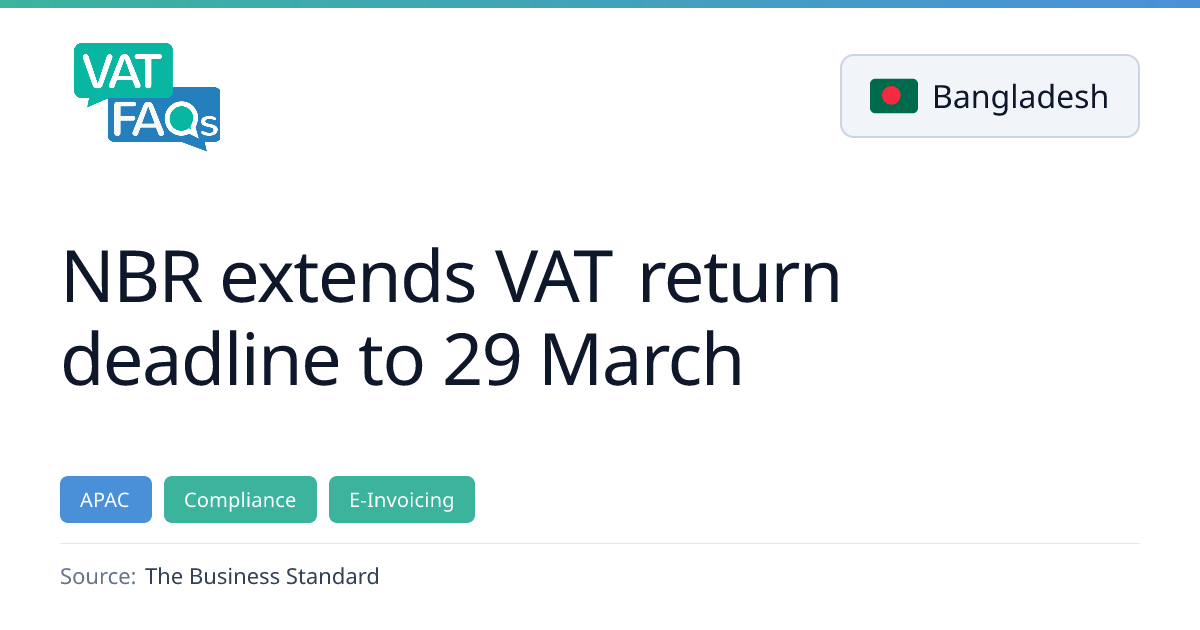 Bangladesh's National Revenue Board has extended the deadline for submitting online VAT returns for the February 2026 tax period to 29 March 2026, a week later than originally scheduled. The extension, granted under Section 64(1a) of the Value Added Tax and Supplementary Duty Act, 2012, was issued to accommodate government holidays and e‑VAT system performance issues.