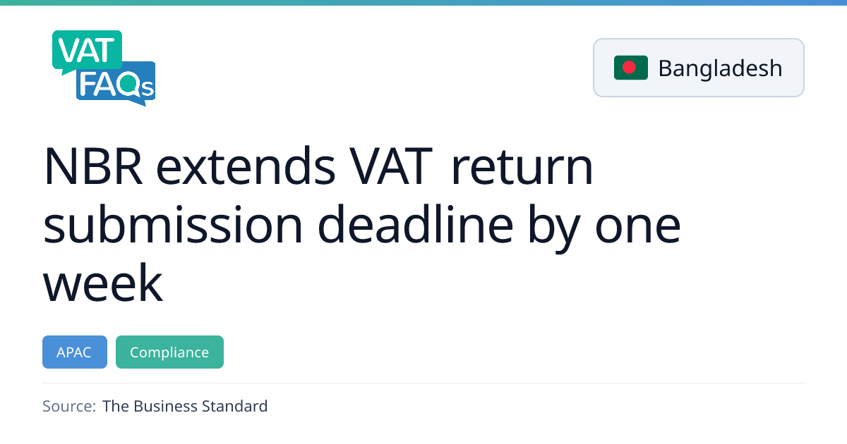 The National Board of Revenue (NBR) in Bangladesh has extended the deadline for filing online VAT returns via its e‑VAT system to 22 February 2026. The extension was granted to accommodate government holidays around Shab‑e‑Barat, a national election, and technical disruptions on 15 February. Taxpayers are urged to submit their January 2026 returns within the new period to avoid penalties.