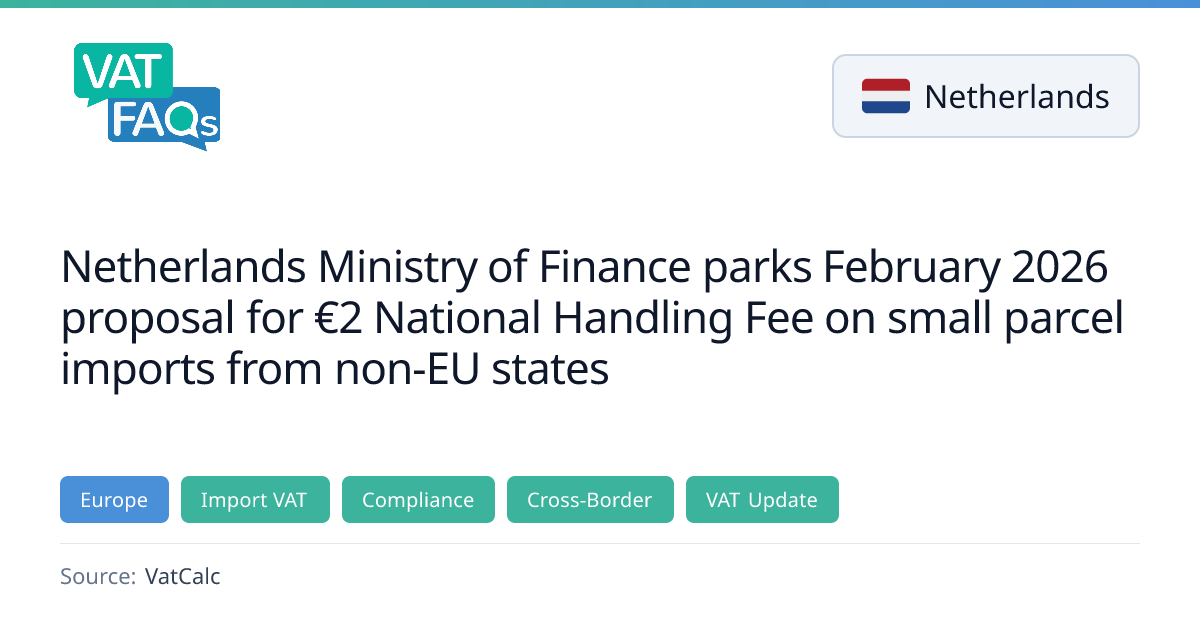 The Dutch Ministry of Finance has suspended its plan to impose a €2 customs handling fee on non‑EU parcel imports under €150, pending further EU action. An interim €3 customs levy will take effect from 1 July 2026, and the EU will remove the €150 de‑minimis exemption in 2028. The Dutch motion has passed the House but awaits Senate approval, with a final decision expected soon.