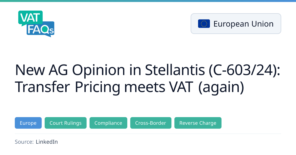 Advocate General Kokott’s Opinion C‑603/24 clarifies how intra‑group transfer price adjustments interact with VAT. The opinion states that such adjustments are not automatically a separate VAT supply, but may alter the taxable amount under Articles 73 and 90 of the VAT Directive if they reflect a variable purchase price agreed upfront. Only when an actual service for consideration exists is a separate supply considered.