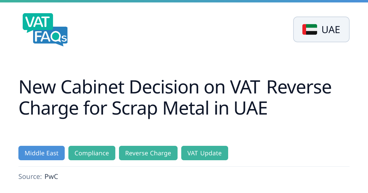 The UAE Ministry of Finance’s Cabinet Decision No. 153 of 2025 introduces a reverse‑charge mechanism for the local supply of scrap metal between VAT‑registered persons, shifting VAT accounting from suppliers to recipients. Effective 14 January 2026, the rule excludes zero‑rated export supplies and requires written declarations and proper documentation to avoid liability.