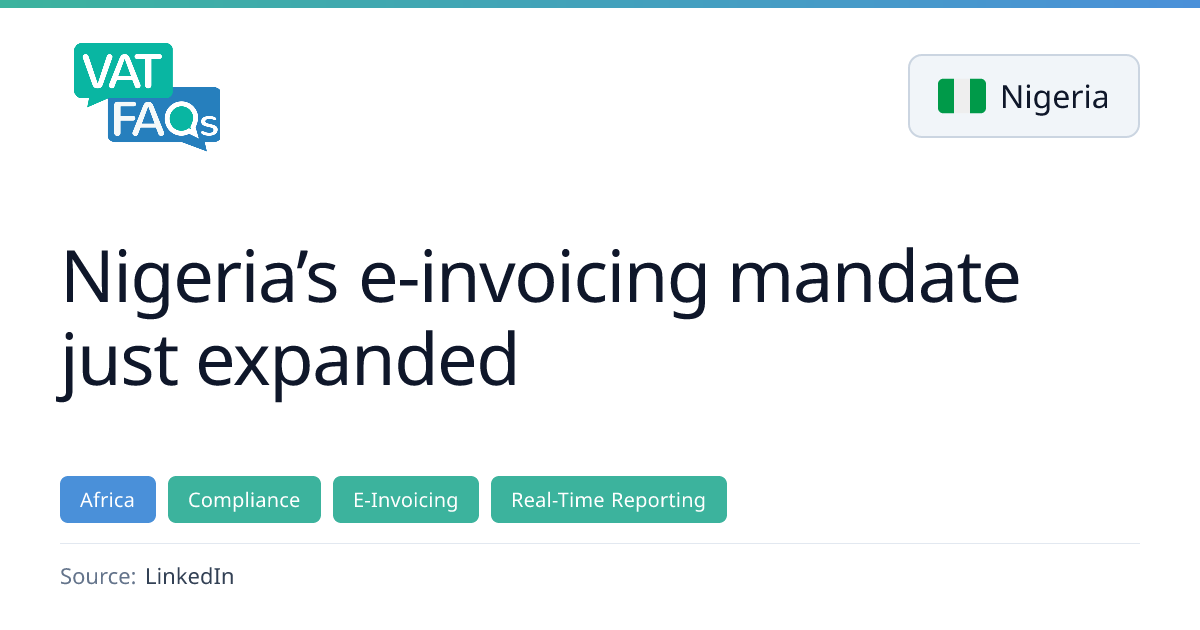 Nigeria has extended its e‑invoicing and Electronic Fiscal System (EFS) to medium‑sized and emerging taxpayers. Medium‑size businesses (₦1B–₦5B revenue) must go live on 1 July 2026, while emerging taxpayers (under ₦1B) must go live on 1 July 2027, with enforcement starting 1 January 2027 and 1 January 2028 respectively. The mandate applies to all VAT‑registered businesses issuing invoices for taxable transactions in Nigeria and requires real‑time invoice generation, validation and transmission through the government platform.
