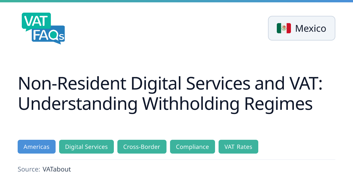 The article explains how withholding VAT regimes are used in Mexico and Argentina to collect VAT on digital services supplied by non‑resident providers. It details the rates and responsibilities of platforms, intermediaries, and customers, and notes that withholding can sometimes replace registration for foreign suppliers.