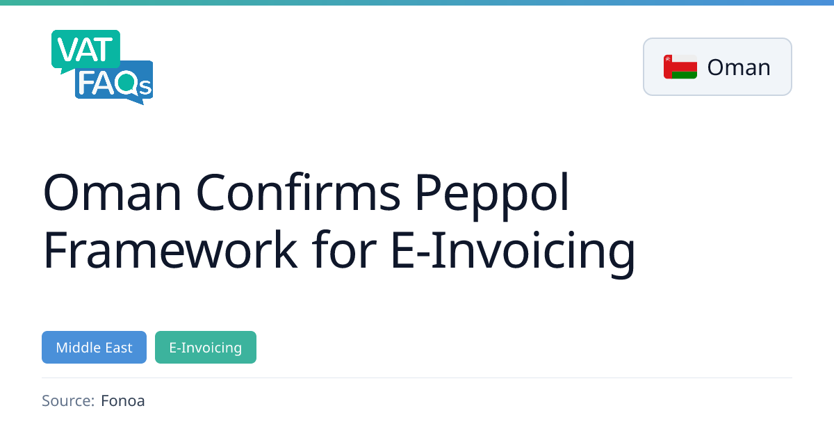 Oman has formally adopted the Peppol e-invoicing framework under its Fawtara programme, covering B2B, B2G and B2C transactions from 2026. A pilot involving the 100 largest taxpayers will start in August 2026, followed by phased implementation. The rollout will use the Peppol five‑corner model and UBL 2.1 data standards.