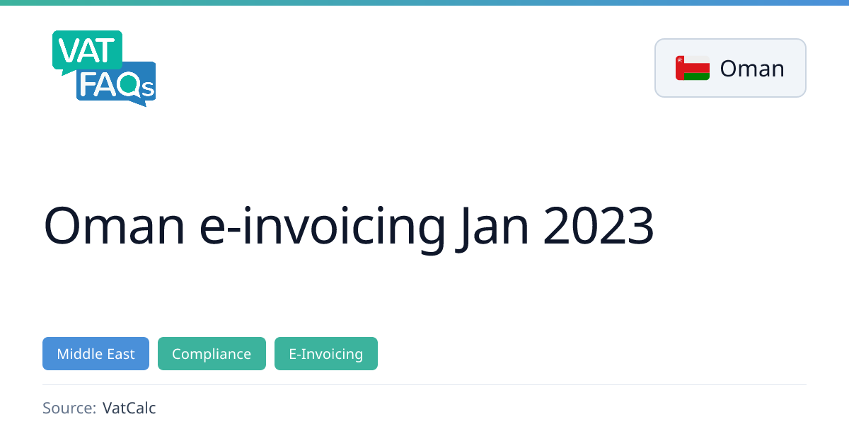 VatCalc reports that Oman will enforce mandatory B2B and B2G e‑invoicing and e‑reporting via a Peppol 5‑corner model starting 1 Aug 2026. The rollout will be phased, with the first wave in August 2026 for the largest taxpayers, a second wave in February 2027, and a third wave in August 2027. The Oman Tax Authority became the official Peppol Authority in January 2026 and published updated FAQs on 8 Dec 2025.