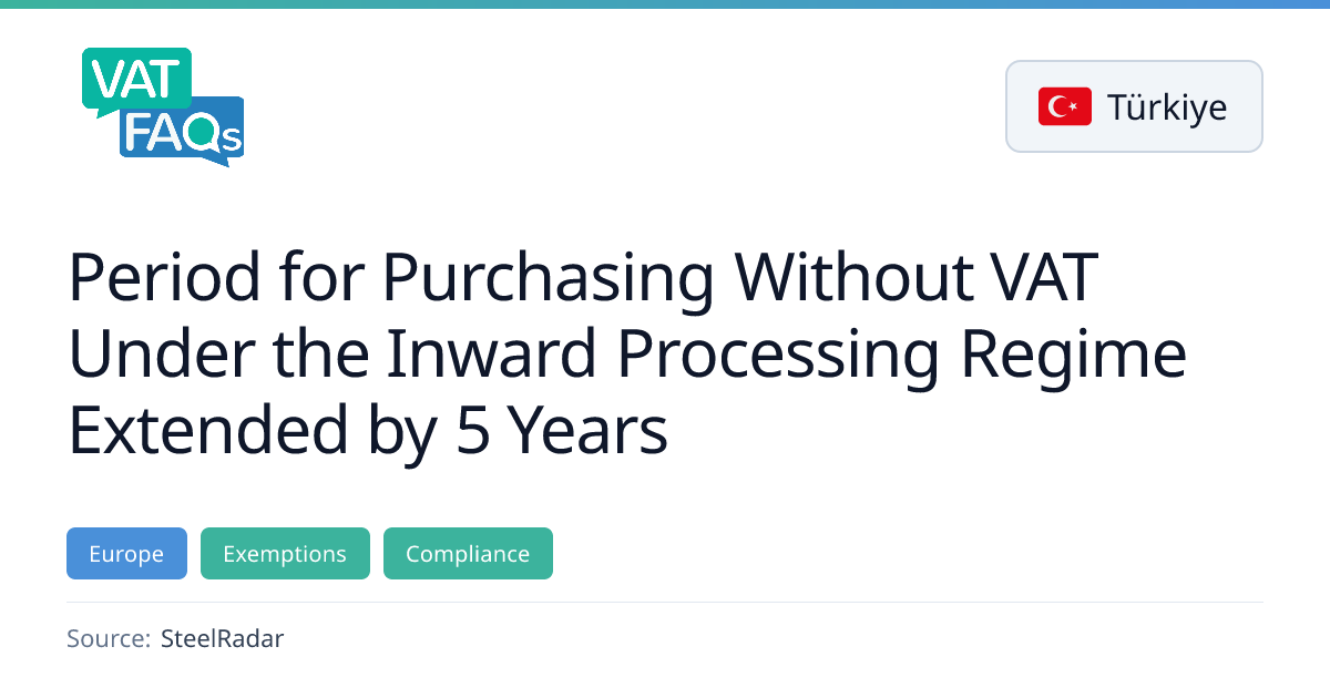 Turkey’s Parliament extended the VAT‑free period for inward processing regime (IPR) purchases from 31 December 2025 to 31 December 2030. The change aims to prevent exporters and manufacturer‑exporters from having to pay VAT upfront on domestic raw materials, thereby protecting cash flow and competitiveness.