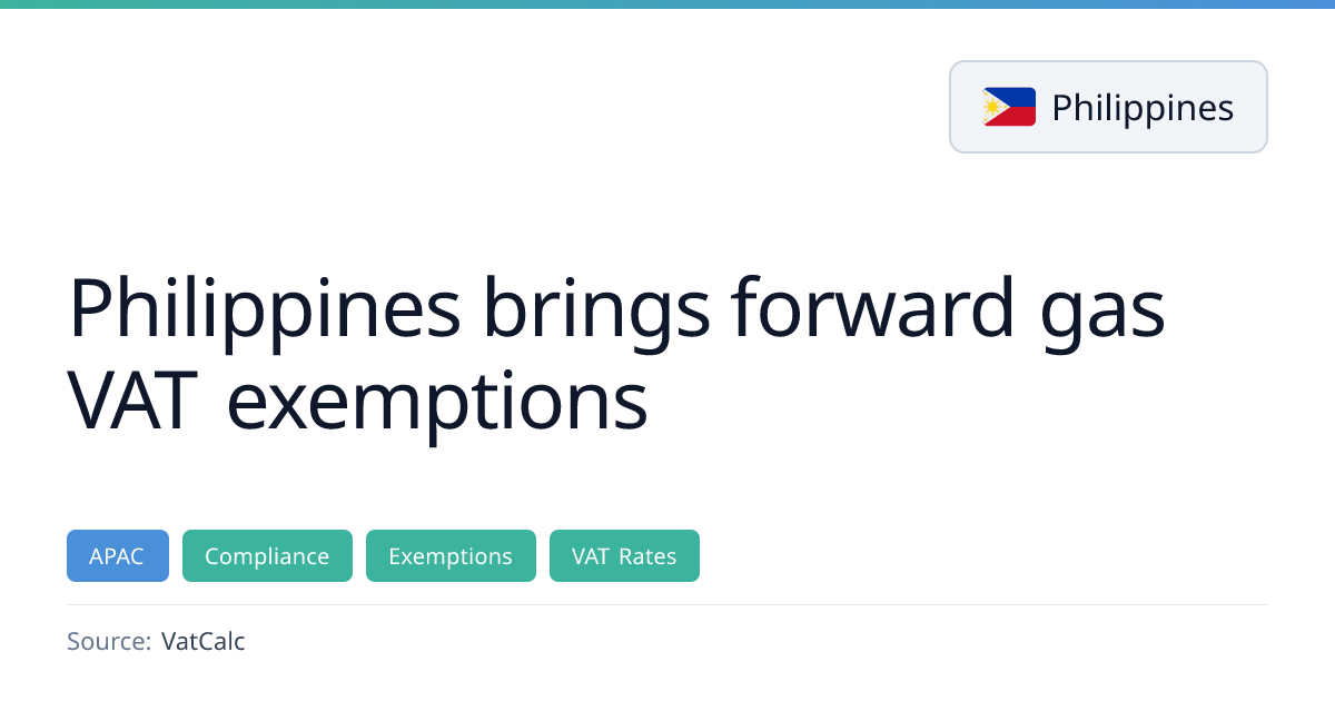 The Philippines has advanced the implementation of VAT exemptions for indigenous natural gas, electricity generated from it, and related ancillary services. The exemptions, part of Republic Act No. 12120, will take effect early April 2026 and require certification from the Department of Energy and validation by the Oil and Electric Power Industry Management Bureaus.