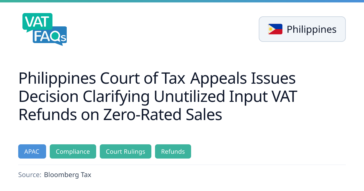 The Philippine Court of Tax Appeals issued a decision (CTA EB No. 2951) on Jan. 16, 2026 clarifying the treatment of unutilized input VAT refunds on zero‑rated export sales. The court partially granted a refund claim by a corporation engaged in export sales, after the Commissioner of Internal Revenue denied the request for lack of proof that service recipients were not doing business in the Philippines.