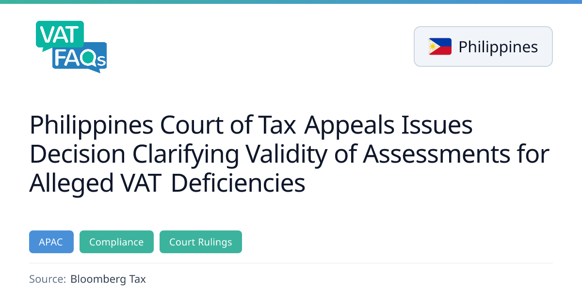 The Philippine Court of Tax Appeals issued a decision on Jan. 19, 2026 (Case No. 10607) clarifying the validity of assessments for alleged tax deficiencies. The ruling covers a range of taxes—including income tax, VAT, expanded withholding tax, and others—and finds that due process was not violated because the Final Decision on the Disputed Assessment (FDDA) stated the relevant facts. The decision provides guidance on how assessments are evaluated for due process compliance.