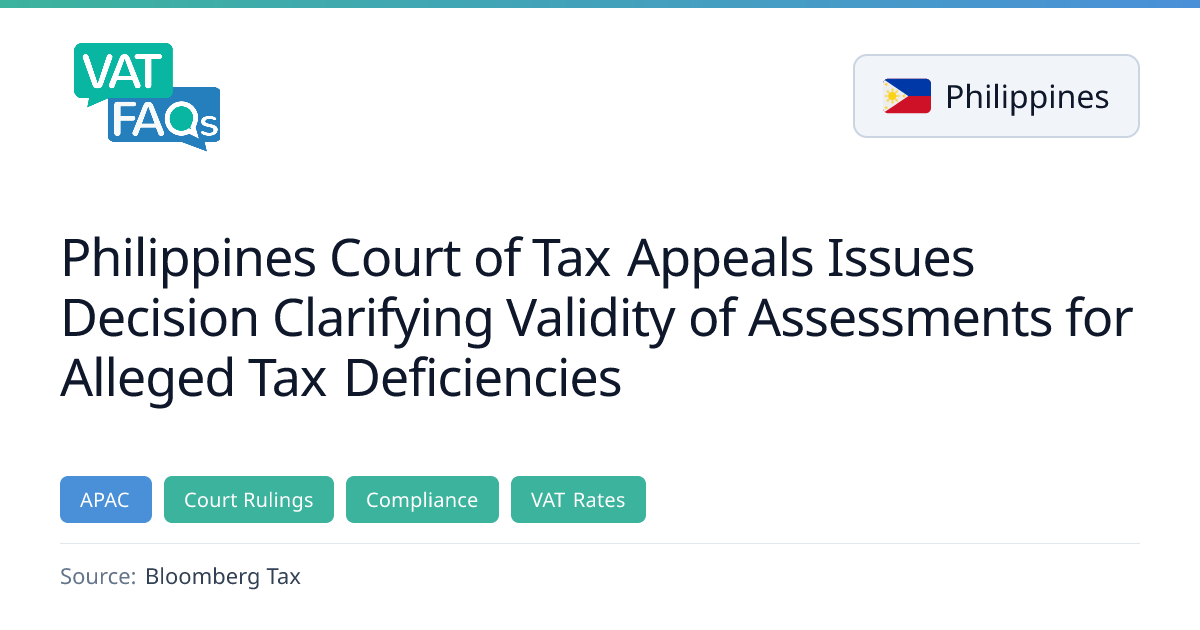 The Philippine Court of Tax Appeals issued a decision on Jan. 19, 2026 (Case No. 10607) clarifying the validity of assessments for alleged tax deficiencies. The ruling covers a range of taxes—including income tax, VAT, expanded withholding tax, and others—and finds that due process was not violated because the Final Decision on the Disputed Assessment (FDDA) stated the relevant facts. The decision provides guidance on how assessments are evaluated for due process compliance.