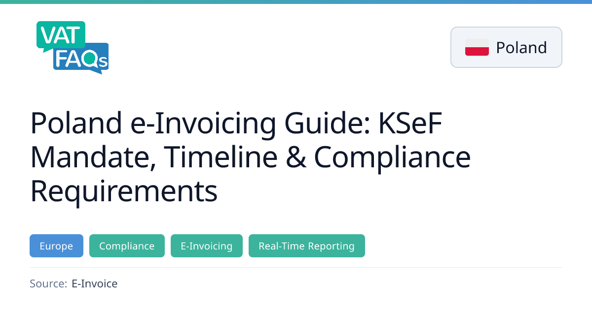 Poland's KSeF e-invoicing system requires all VAT‑registered businesses to submit B2B invoices via a centralized platform using the FA(3) XML format. Large taxpayers must comply from February 2026, others from April 2026, with a grace period through 2026 and penalties starting in 2027. The system assigns unique identifiers, stores invoices for ten years, and imposes up to 100 % VAT penalties for non‑compliance after the grace period.