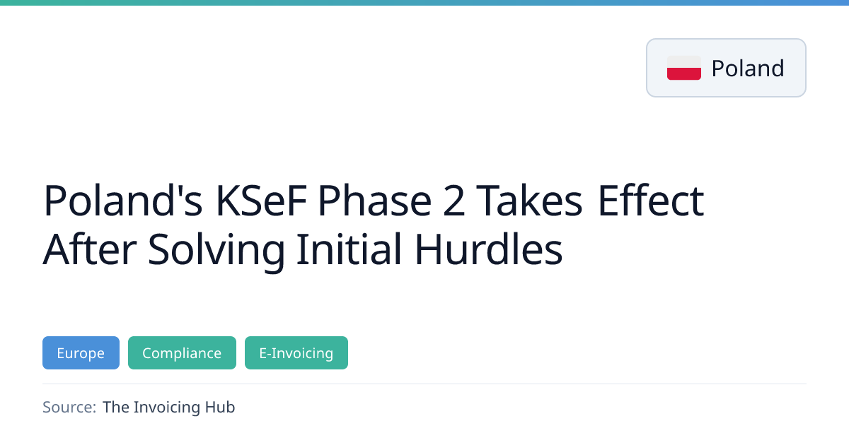 Poland has made e‑invoicing mandatory for all VAT‑registered businesses through its KSeF platform, effective February 2026 for large taxpayers and April 2026 for SMEs and foreign entities. The new system integrates with the existing JPK SAF‑T reporting framework, requiring KSeF identification numbers in VAT returns and imposing penalties for non‑compliance. The rollout also mandates KSeF IDs in bank transfers from August 2026 and extends to micro‑entrepreneurs from January 2027.