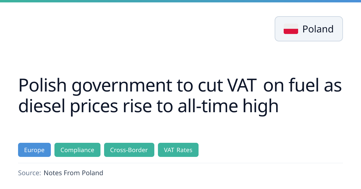 Poland announced a package to curb fuel costs, cutting VAT on motor fuels from 23% to 8% and reducing excise duty, while also planning a daily price cap. The move, aimed at easing the impact of rising diesel prices, faces EU scrutiny as the commission says VAT cuts on fuels are not permitted under EU law. The government expects the VAT cut to cost about 900 million zloty per month.