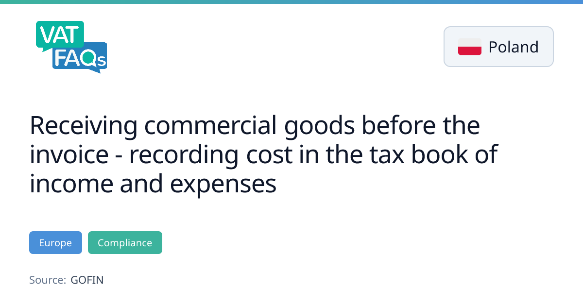 The article explains how Polish tax law requires recording purchases of commercial goods immediately upon receipt, and outlines procedures when goods are received before the invoice, including preparing a detailed description and attaching it to the invoice if received in the same month. It also notes the deadline for entries (20th of each month) and the conditions under which entries can be delayed until invoice receipt.