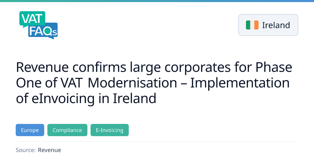 Ireland’s Revenue has identified the large corporates that will be subject to Phase One of the VAT Modernisation programme, requiring them to issue structured eInvoices from 1 November 2028. All Irish businesses must also be able to receive such eInvoices from the same date, ahead of the EU-wide ViDA cross‑border rules set for July 2030.