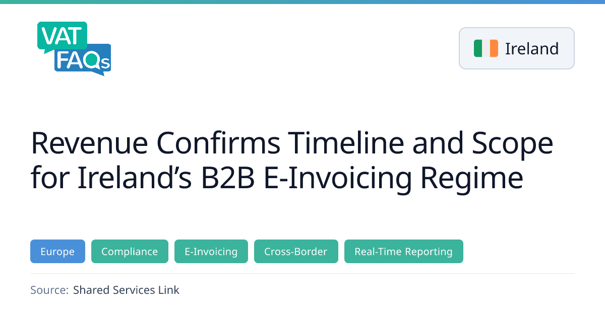 On 8 October 2025, Irish Revenue released a roadmap for implementing the EU's ViDA e‑invoicing and real‑time reporting requirements. The plan phases the rollout, with large corporates required to adopt the system in November 2028, all VAT‑registered businesses in intra‑EU B2B trade by November 2029, and full compliance for all cross‑border EU B2B transactions by 1 July 2030. The definition of a large corporate was clarified on 10 February 2026.