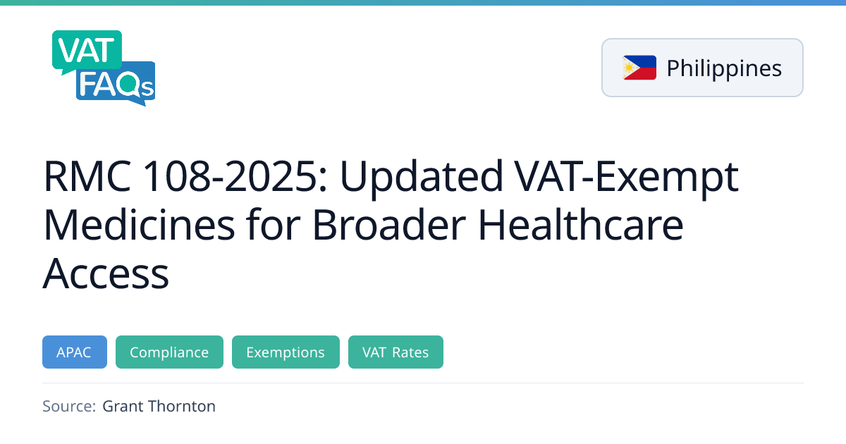 The Philippine Bureau of Internal Revenue’s RMC 108-2025, issued on 8 January 2026, expands the list of VAT‑exempt drugs under the TRAIN and CREATE Acts. The new list now covers 675 cancer drugs, 542 hypertension drugs, 323 diabetes drugs, 300 mental‑illness drugs, 173 high‑cholesterol drugs, 154 kidney‑disease drugs and 75 tuberculosis drugs, significantly broadening patient access to essential medicines.