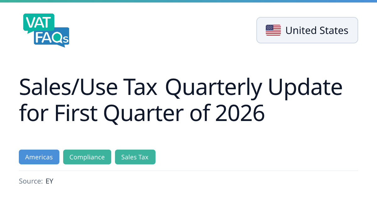 The EY Sales and Use Tax Quarterly Update provides a summary of the major legislative, administrative and judicial sales and use tax developments for the first quarter of 2026. It highlights recent changes involving nexus, tax base and exemptions, technology, and compliance and controversy.