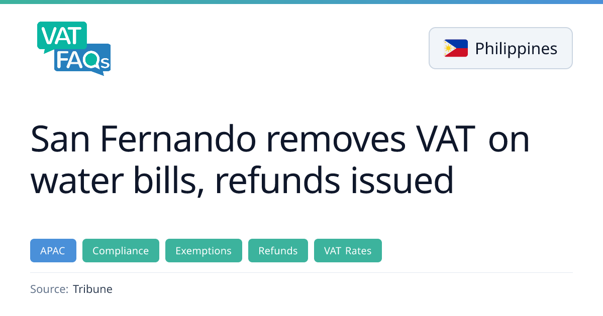 The city of San Fernando, Pampanga, Philippines has announced that water bills will no longer carry the 12% Value-Added Tax (VAT) starting March 2026. Residents will receive full refunds for VAT collected between 17 November 2025 and February 2026. The measure, announced by Mayor Vilma B. Caluag, aims to reduce household costs and ease living burdens.
