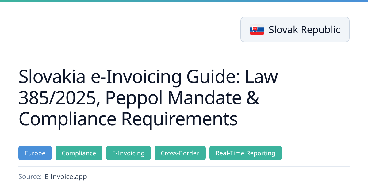 Slovakia will enforce mandatory B2B e-invoicing via the Peppol network from 1 January 2027 under Law 385/2025 Z.z., following a voluntary testing period in 2026. All e-invoices must use the EN 16931 XML standard (UBL 2.1 or CII), be issued within 15 days, and reported within 5 days, with penalties up to €10,000 per infraction and €100,000 for repeated violations.