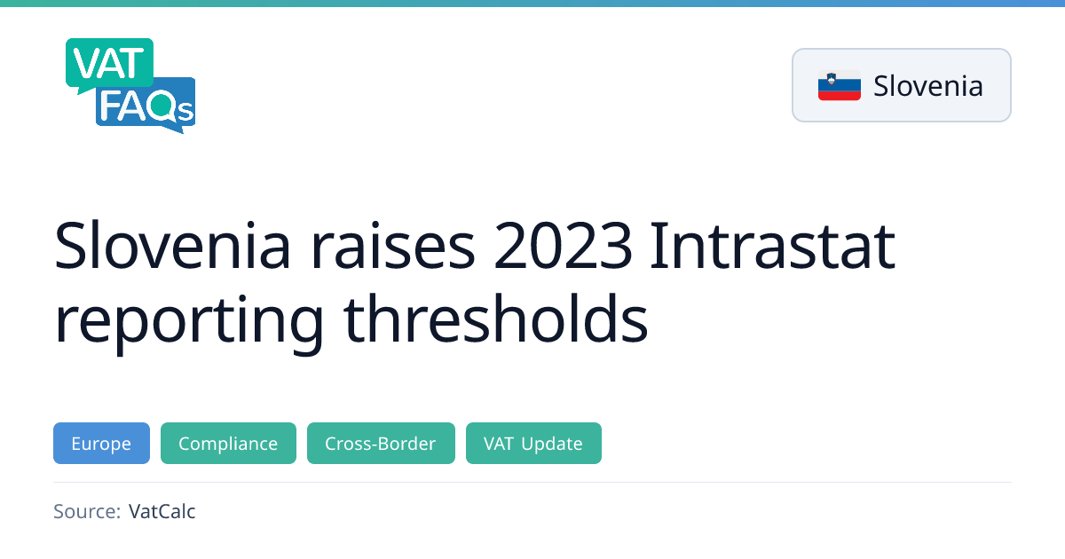 Slovenia has increased its Intrastat reporting thresholds for arrivals and dispatches of goods with other EU member states, effective 1 January 2026. The arrivals threshold rises from €240,000 to €300,000 per annum (statistical €4 million), while dispatches rise from €270,000 to €280,000 per annum (statistical €9 million). These changes affect larger shippers and are part of Slovenia’s annual reporting obligations for intra‑EU trade.