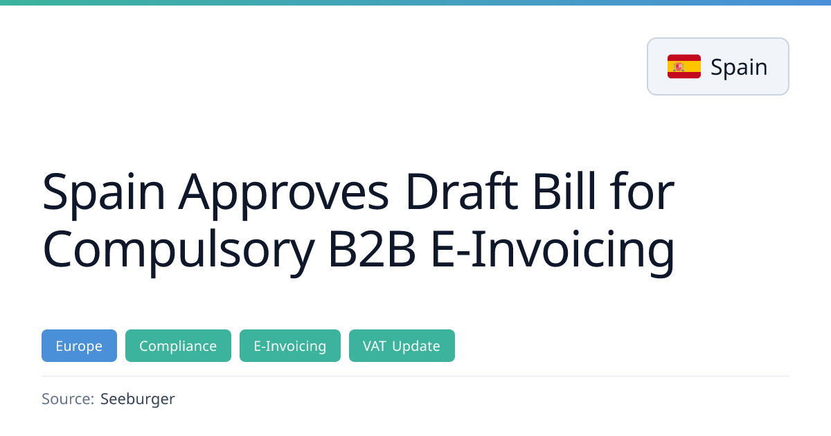 Spain has approved a draft bill that will extend mandatory e‑invoicing from the B2G sector to B2B transactions. The new law requires companies to use certified invoicing software from 1 January 2024 and sets a phased implementation schedule based on turnover thresholds. Non‑compliance can lead to fines up to €10,000.