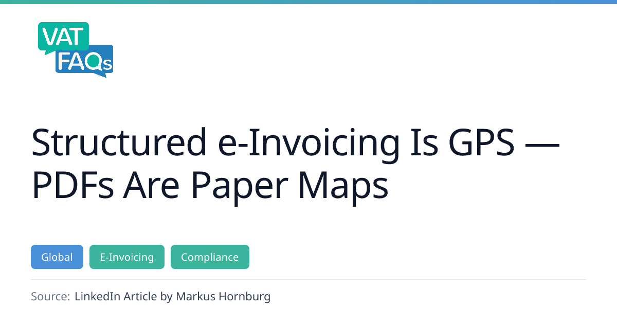 The article argues that structured e-invoicing is essential for real-time compliance, contrasting it with static PDF invoices that are likened to paper maps. It highlights the limitations of PDFs in modern tax and audit contexts and stresses the need for machine‑enforceable, globally standardised data objects. The piece serves as a commentary on the evolving expectations of tax authorities and the strategic importance of real‑time visibility for CFOs.