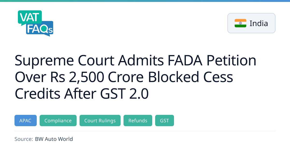 The Supreme Court of India has admitted a petition by the Federation of Automobile Dealers Associations (FADA) concerning more than Rs 2,500 crore in blocked compensation cess credits that became unusable after the implementation of GST 2.0. The court has scheduled the next hearing for March 25 2026 and is considering a transitional mechanism to allow these credits to be offset against other GST liabilities. The case could set a precedent for handling legacy tax credits during indirect tax reforms.
