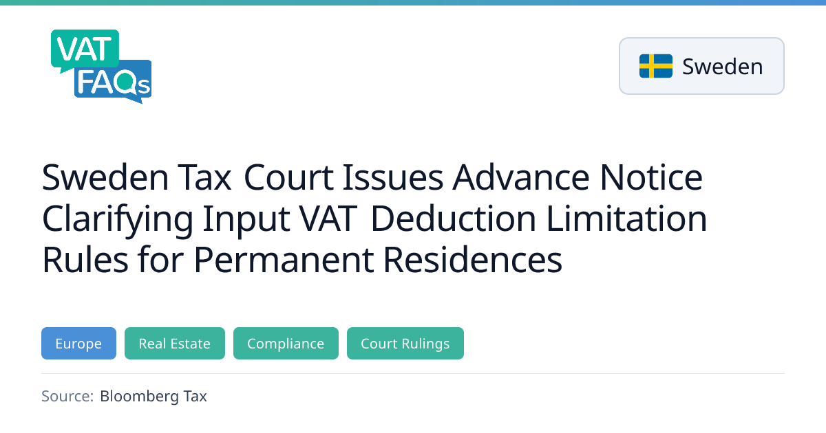 The Swedish Tax Court issued Advance Notice No. 54‑25/I on 17 Dec 2025, clarifying that the input VAT deduction limitation for permanent residences does not extend to parking garages that are clearly separated from the residence. In the case, a taxpayer owning a residential building, a commercial building and a parking garage sought guidance, and the court ruled that the garage’s design and use meant it was not part of a permanent residence, so its costs are not subject to the limitation.