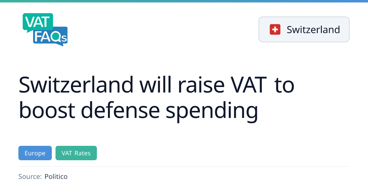 Switzerland will temporarily increase its VAT rate by 0.8 percentage points from 8.1% to 8.9% starting in 2028 for a decade to raise about 31 billion Swiss francs for defense spending. The change requires a constitutional amendment and a public consultation in spring, and the extra revenue will feed an armament fund with borrowing capacity.