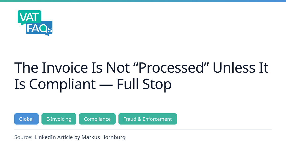 The article argues that invoices cannot be considered processed unless fully compliant, highlighting that e‑invoicing mandates cover only a fraction of compliance requirements and that tax authorities focus on tax relevance rather than business legitimacy. It warns that relying solely on ERP or e‑invoicing platforms can create significant risk and that invoice fraud can lead to severe penalties.