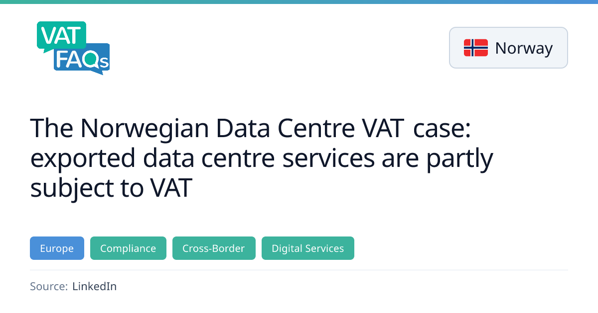 The Norwegian Tax Appeals Board ruled that data centre services supplied to non‑residents are not fully exported services; the portion involving physical storage, monitoring, power and infrastructure must attract Norwegian VAT. The decision rejects the view that such services are entirely remote and VAT‑exempt, and provides analysis that may interest other jurisdictions.