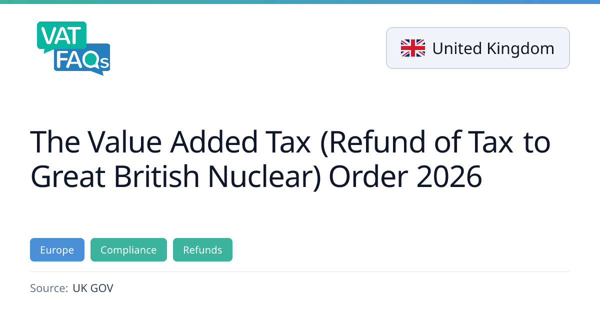 The UK government has introduced the Value Added Tax (Refund of Tax to Great British Nuclear) Order 2026, allowing companies designated under section 317 of the Energy Act 2023 (GBE‑N) to claim VAT refunds on services that support their non‑business activities. The order was published on 18 March 2026 and provides a statutory framework for these refunds.