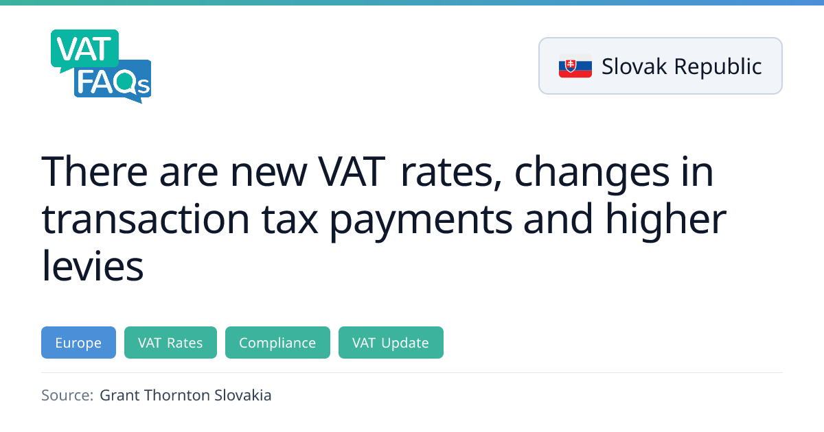 Slovakia will implement several VAT and tax changes from 1 January 2026, including removing the reduced 19% rate for processed foods high in salt or sugar, expanding the 5% reduced rate to certain printed media, exempting individuals from the financial transaction tax, and introducing a 0.0125% monthly special levy on pension and collective investment companies.