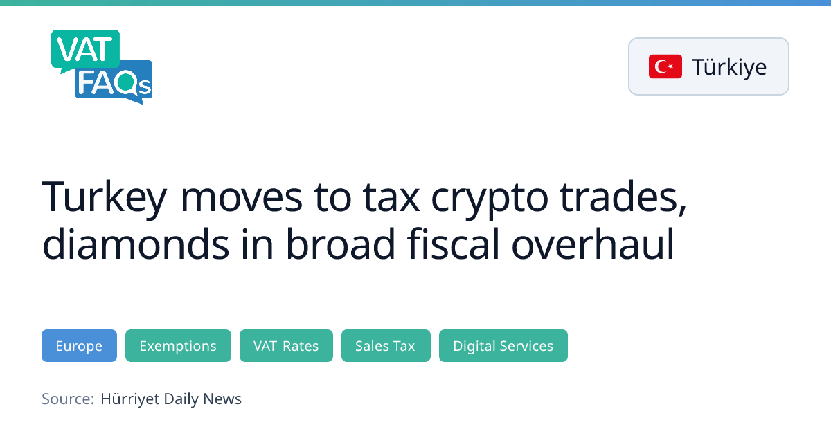Turkey’s new 19‑article bill introduces a 0.3% transaction tax on crypto trades and a 20% special consumption tax on diamonds, while explicitly exempting crypto transactions from VAT. The proposal also removes certain tax deductions and adjusts other tax exemptions, marking a significant shift in the country’s fiscal framework.
