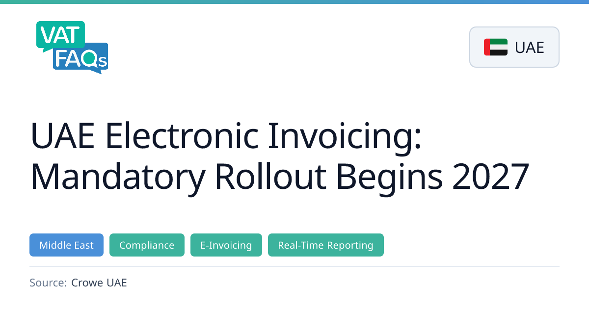 The UAE Ministry of Finance has issued new Electronic Invoicing Guidelines, mandating B2B and B2G transactions to use Peppol-based XML invoices from 2027. The rollout is phased: businesses with ≥ AED 50 million revenue go live on 1 January 2027, smaller businesses on 1 July 2027, and government entities on 1 October 2027. The system requires 51 mandatory data elements and real‑time reporting via accredited service providers.